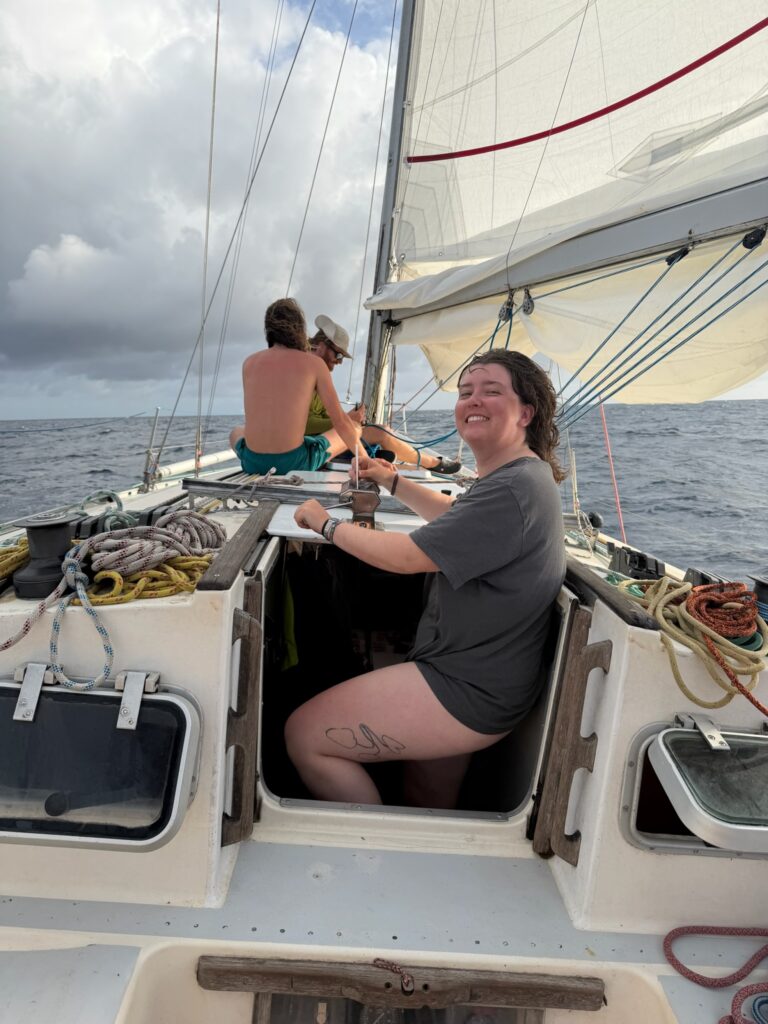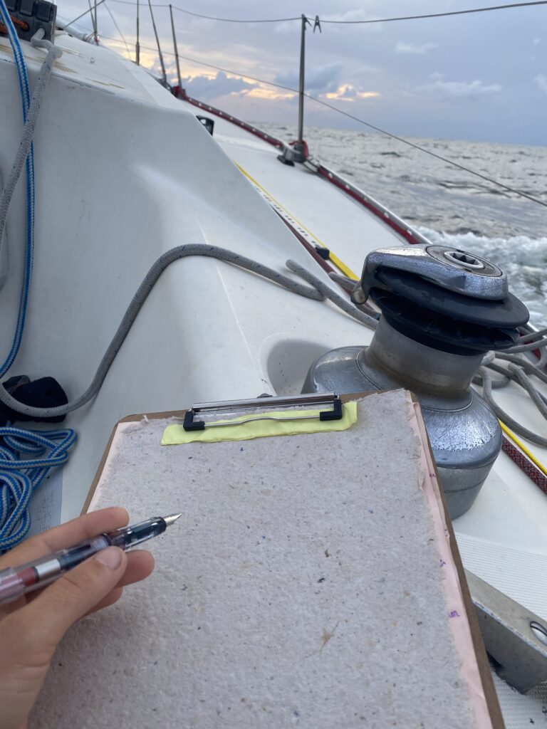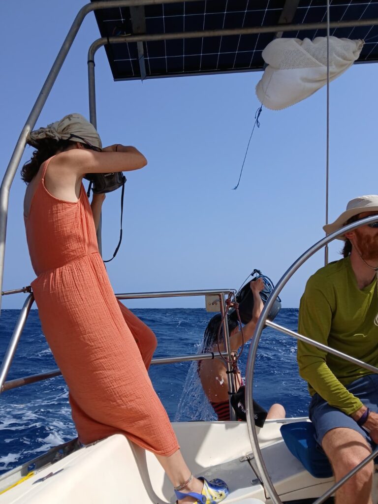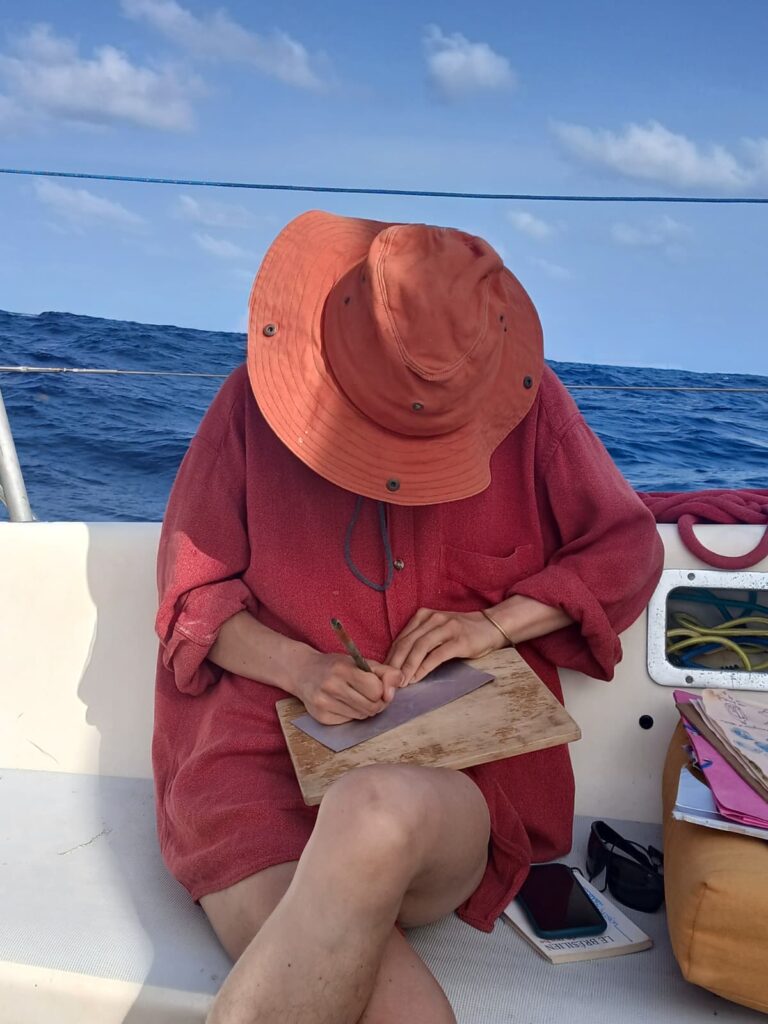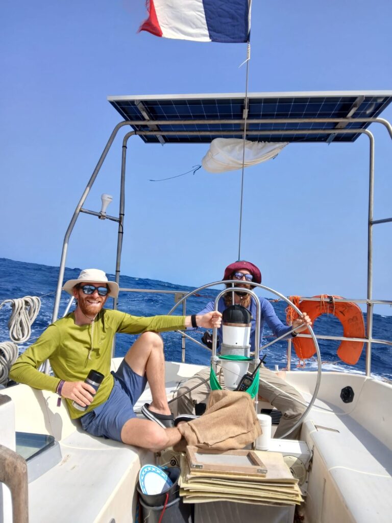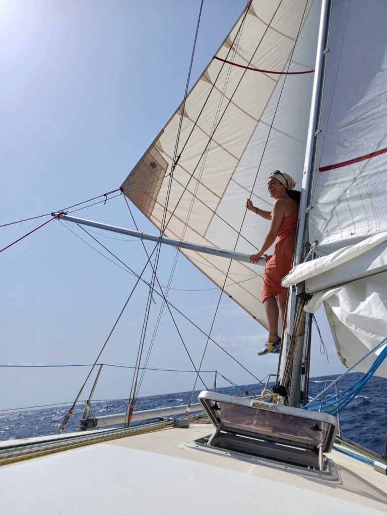Cela fait deux mois tout pile qu’on est parti.e.s. On aura mis deux mois pour faire Morlaix-Belém au lieu des 1 mois et demi escompté. Personne à bord n’est encore prêt à l’idée que ce sont les côtes brésiliennes que nous verrons. Il n’y a que la mer autour de nous pour l’instant, et depuis deux semaines les seuls objets flottants que nous avons croisé sont deux cargos. C’est tout. En revanche, des dauphins (timides cette fois) ça oui, et des oiseaux, qui prennent souvent le taxi flottant sur nos panneaux solaires ou même une fois sur la bôme.