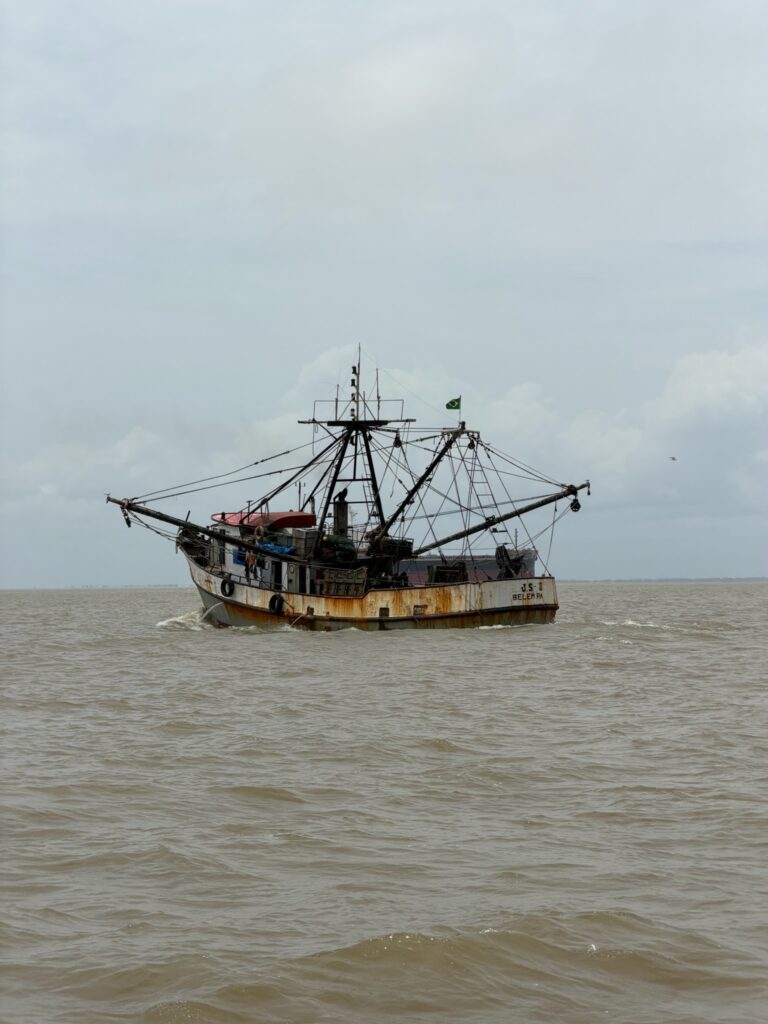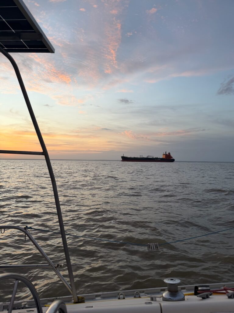 Maintenant c’est sûr, on a quitté la pleine mer. Quand je regarde le sillon d’eau derrière le bateau, l’eau est sans reflet et d’une teinte qui paraît grise ou marron, je ne sais pas encore. Nous verrons ça quand il fera jour. Le trajet dans l’embouchure du Rio Pará est long mais doux, une vitesse de 3-4 noeuds au génois uniquement : on a rangé la grand voile cette nuit, car il y avait des orages aussi au loin. Maintenant, le temps est clair, et je me rends de plus en plus compte que mon imagination enfle autour de ces lignes de côtes plates, dans l’attente de la lumière du jour. Même au bord des côtes, nous n’avons aucun réseau. On est encore loin du monde.
