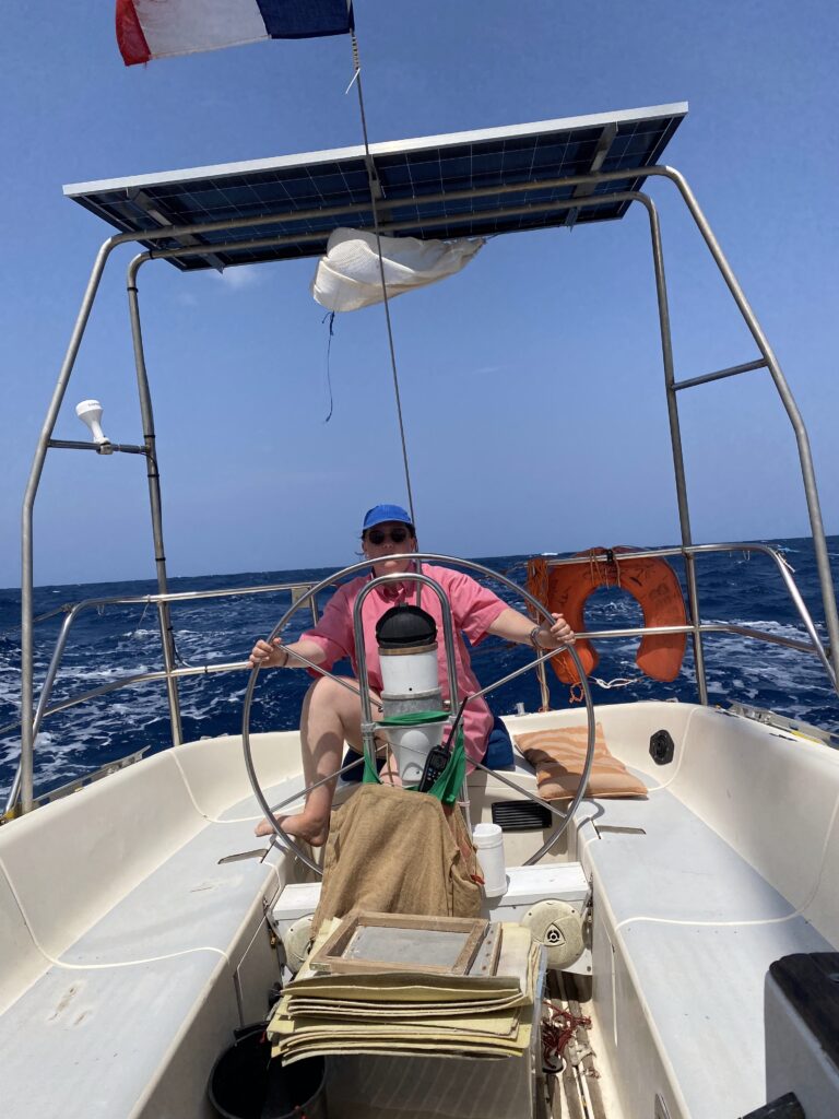 Il fait très chaud, on multiplie les seaux d’eau sur nos têtes pour se rafraîchir un peu. Malheureusement on en perd un en mer dans un instant de mégarde et l’autre se fend. Va t-on passer aux douches avec la bouilloire ? On pourrait aussi se baigner, mais aucun de nous n’a pensé à vérifier que cette zone est ok pour nager, et puis il faudrait s’accrocher, car on a une vitesse moyenne de 7-8 noeuds actuellement.