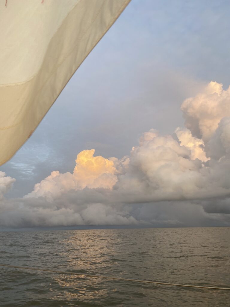 Quand la lumière du matin arrive enfin, les côte sont là, c’est incroyable. Il y a en face les plus beaux nuages que j’ai vu depuis le début du voyage, ils étincellent de l’intérieur. On commence à croiser des pêcheurs, et des cargos. Ma doué, on arrive.