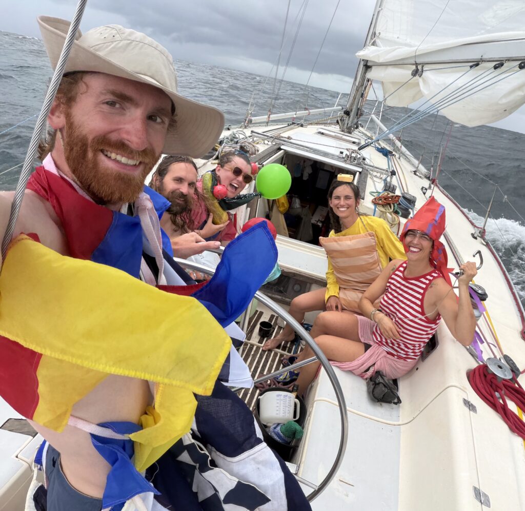 Tout le monde fait avec les moyens du bord : Morgane se déguise en éponge, Anna en sirène de la fête, Alex en Tom Hanks avec son ballon Wilson, Dimitri en guirlande de pavillons et moi, en leurre géant. Ce midi c’est thon bien sûr (pané au gofio, avec du riz et le reste de kimchi de la mer) et on offre une gorgée de champagne au bateau, une gorgée pour la mer, et le reste pour nous. C’est grisant sous cette météo encore bien grise. On s’approche officiellement, même si toujours pas de côtes à l’horizon. On verra les phares à la nuit tombée.