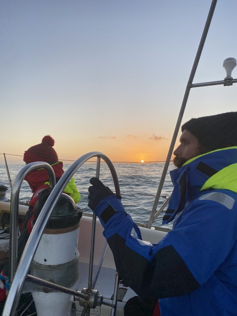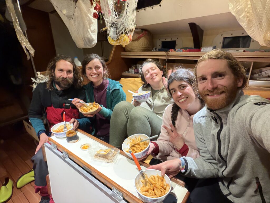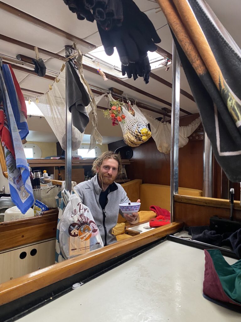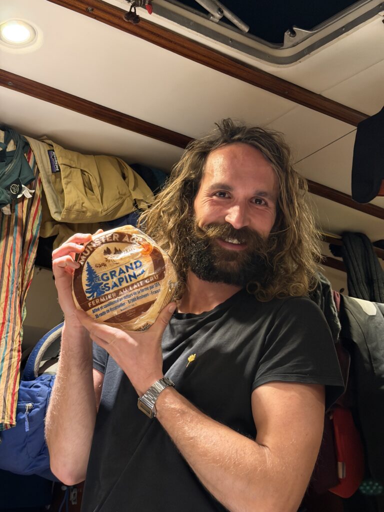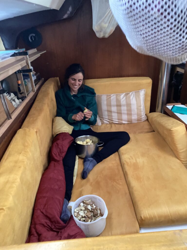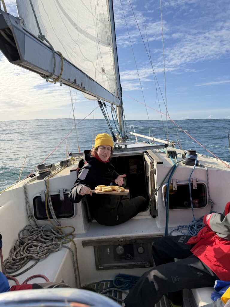 Ce matin on fait la rencontre d’Oliver, une mouette qui essaye de manger le doigt d’Anna quand elle sympathise à la barre. Il reste avec nous un temps, et je vois une famille de dauphins sauter autour du bateau pendant mon dernier quart de la nuit à l’orée du jour. C’est aussi la journée où on installe enfin le spi, la grande voile fine qu’on met à l’avant du bateau quand on a a un vent arrière. Dimitri le déploie et je suis à la barre, c’est jouissif la beauté et la vitesse permise avec cette voile. Le plaisir ne dure pas longtemps car bientôt il fait nuit et un boot lâche à cause d’une fixation censée être solide qui devait remplacer un noeud de chaise sur l’écoute : pas du tout ! Donc on remballe. Après avoir vécu cette tempête, les quarts paraissent tout sages maintenant.