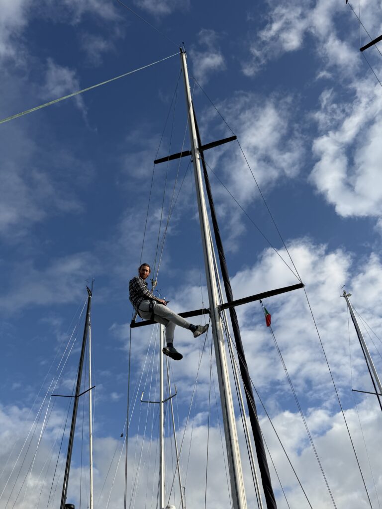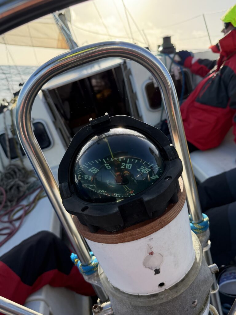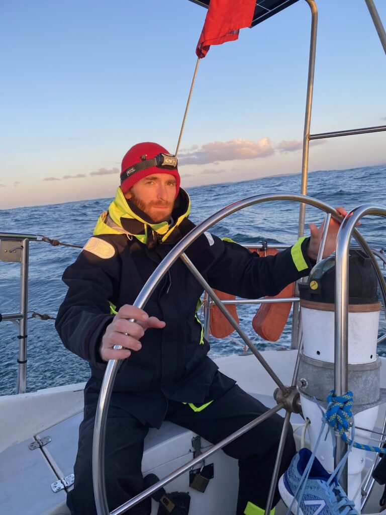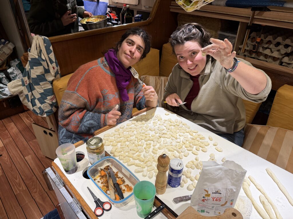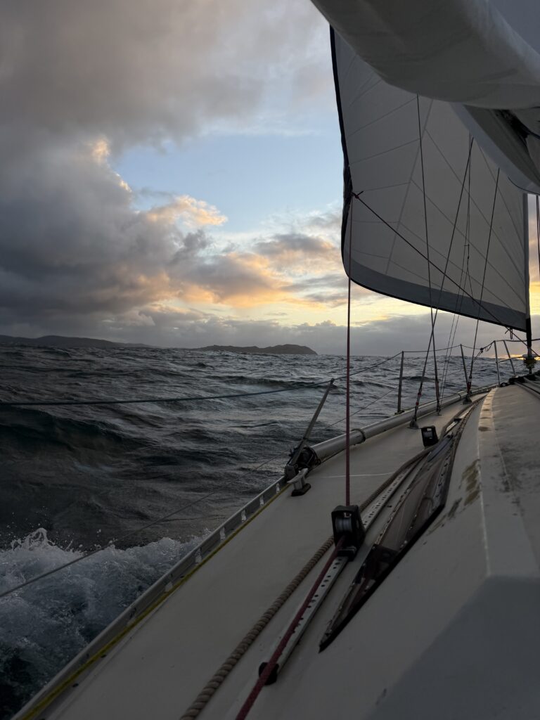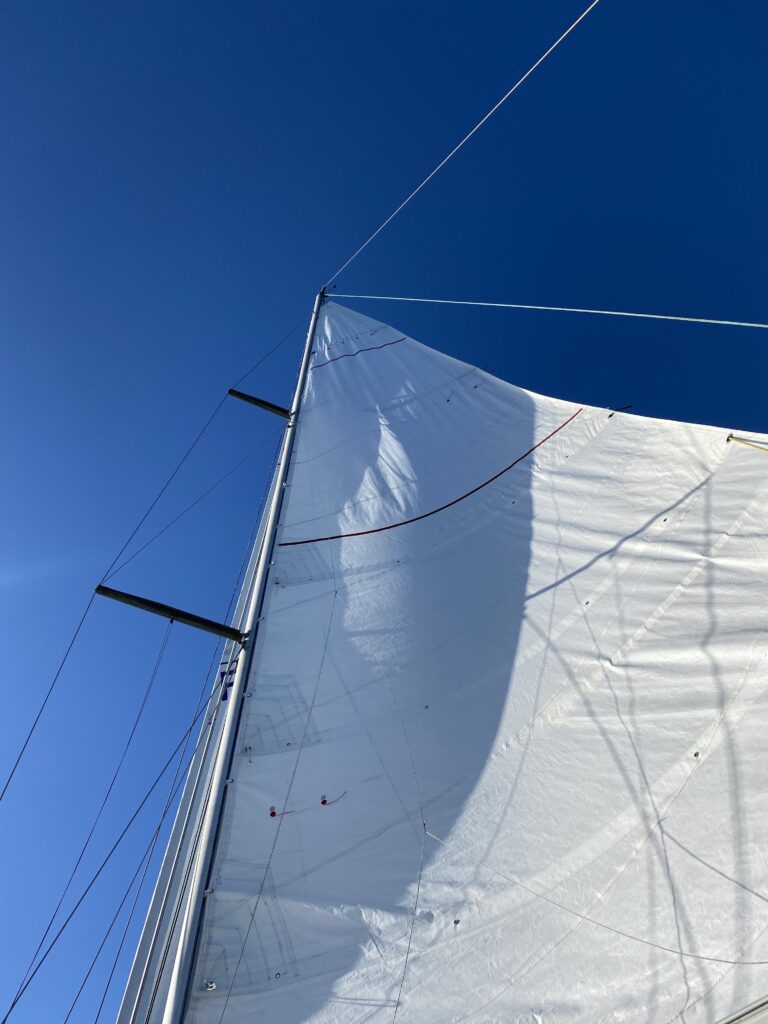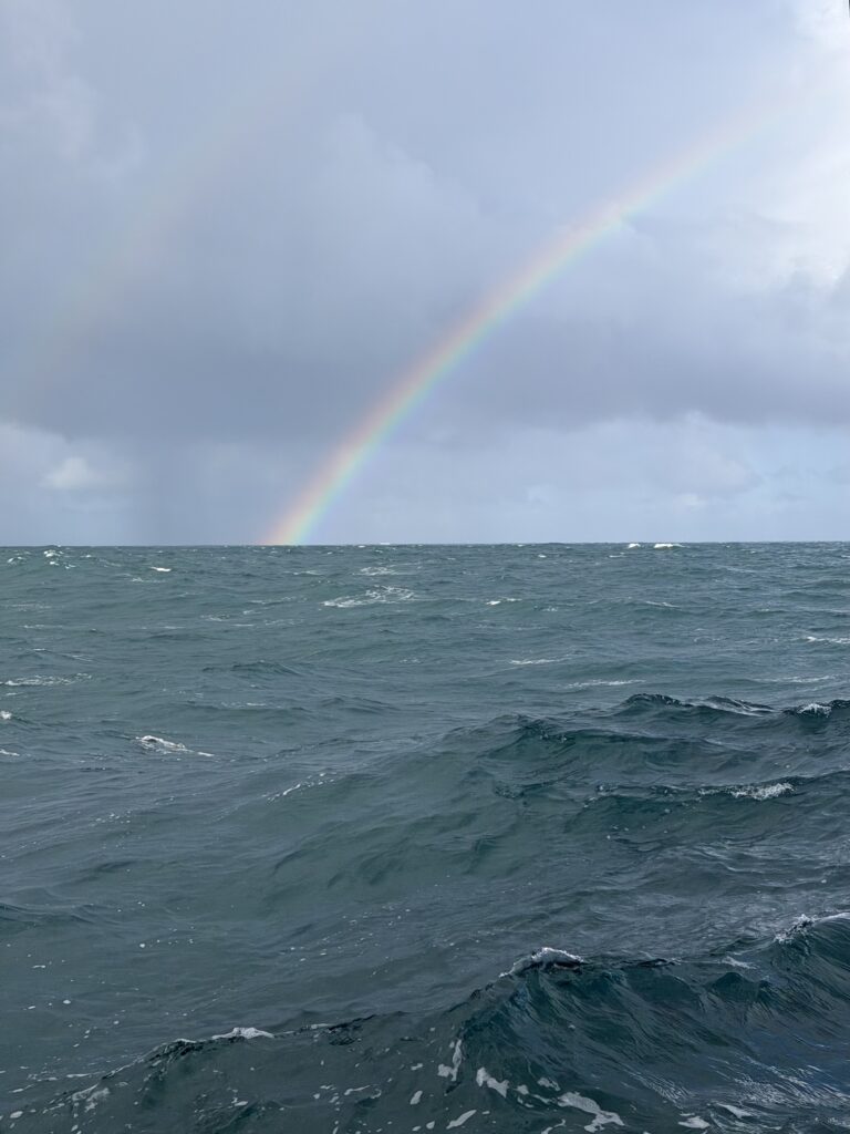 Ce matin on fait la rencontre d’Oliver, une mouette qui essaye de manger le doigt d’Anna quand elle sympathise à la barre. Il reste avec nous un temps, et je vois une famille de dauphins sauter autour du bateau pendant mon dernier quart de la nuit à l’orée du jour. C’est aussi la journée où on installe enfin le spi, la grande voile fine qu’on met à l’avant du bateau quand on a a un vent arrière. Dimitri le déploie et je suis à la barre, c’est jouissif la beauté et la vitesse permise avec cette voile. Le plaisir ne dure pas longtemps car bientôt il fait nuit et un boot lâche à cause d’une fixation censée être solide qui devait remplacer un noeud de chaise sur l’écoute : pas du tout ! Donc on remballe. Après avoir vécu cette tempête, les quarts paraissent tout sages maintenant.