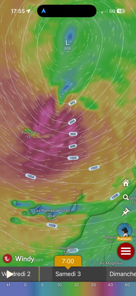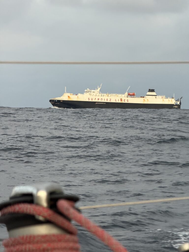 Pendant toute la dérive on a avancé vers le sud est, ce qui nous rapproche des côtes des Canaries, la prochaine destination. Il est bon d’avancer enfin avec la voile sans trop de vent, on a un bon vent du nord qui nous pousse : enfin les alizés montrent leur chemin.