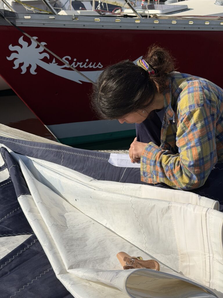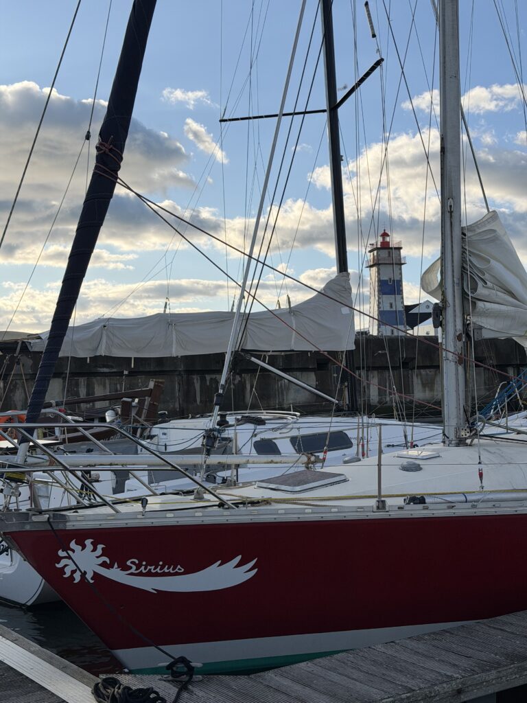 Après un long temps d’avancée lente : on se rend compte que les bouées ne sont pas là, et on cherche à mettre l’ancre, mais sans succès : soit pas assez de fond soit le sol ne convient pas. Alors on décide d’installer le moteur de l’annexe sur Sirius, mais cela ne fonctionne pas pour nous faire avance., le moteur sort de l’eau et est inefficace. Il ne peut pas nous emmener au port. Deuxième idée : on gonfle l’annexe en se disant qu’elle peut tracter le bateau vers le port : on se dit vite que c’est une mauvaise idée ce sera trop dangereux, comme si on avait une remorque de 12m sur l’eau. Alors on décide d’une autre voie: partir à deux sur l’annexe chercher du gasoil à la ville pendant que les trois autres restent au bateau pendant qu’il dérive et remettent la voile si besoin.